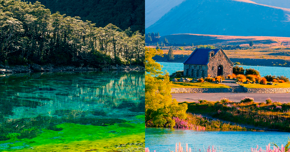 📍Imagem: Lake Tekapo (à esquerda) e Blue Lake (à direita)