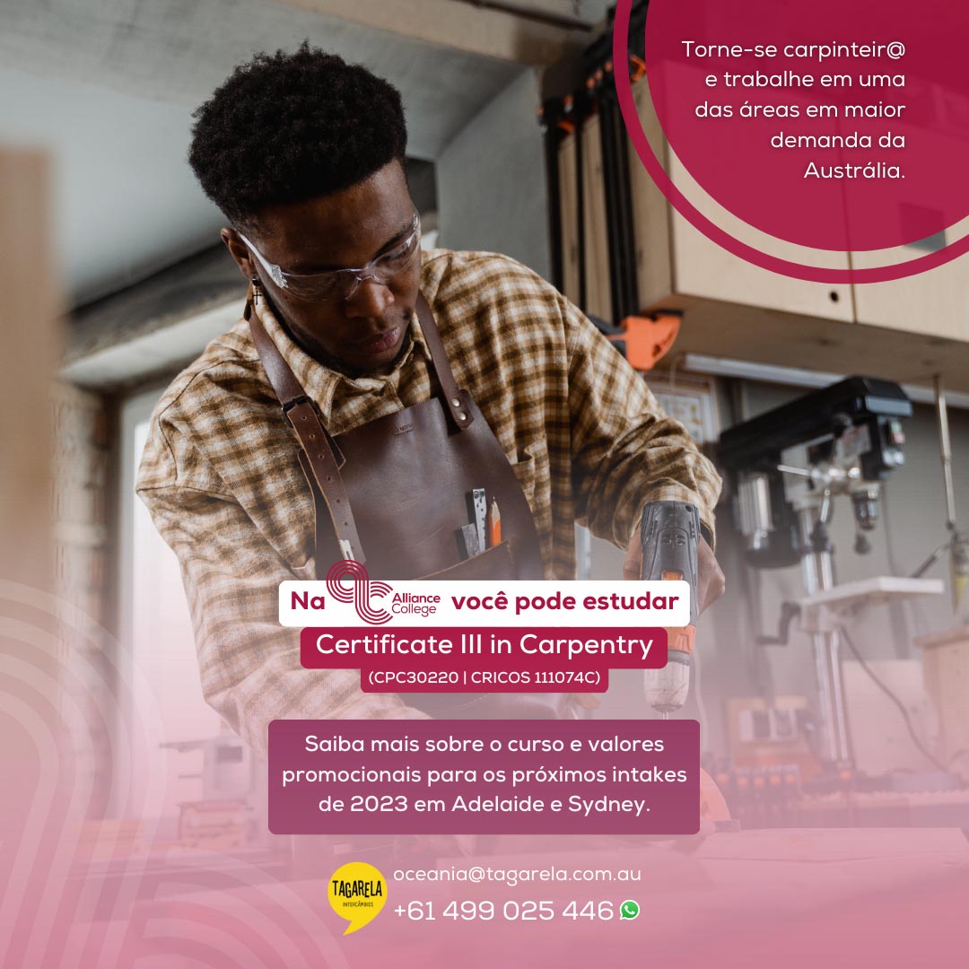 A Tagarela Intercâmbios tem parceria com a Alliance College, instituição de ensino que atua há 40 anos na Austrália e oferece cursos de inglês e técnicos (VET), entre eles, o de carpintaria. Para saber mais sobre o curso e a escola, solicite o atendimento de um dos nossos consultores, clicando aqui.