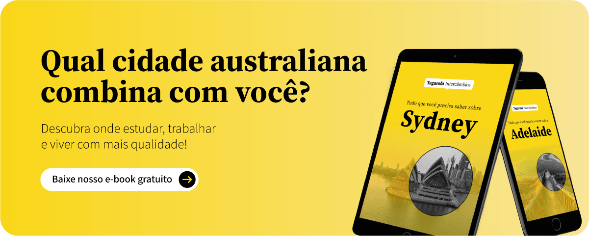 Há pessoas que se questionam sobre qual é a melhor cidade para se morar na Austrália e em qual das cidades australianas há mais oportunidades de trabalho, por exemplo. Não há uma resposta única para essas perguntas pois isso vai depender do perfil de cada estudante. Para quem prefere opções mais urbanas com muitas alternativas de programas culturais, esportivos e gastronômicos, por exemplo, Melbourne e Sydney podem ser boas escolhas. Já para quem ama praia, sol e calor, Gold Coast e Perth podem ser opções melhores. Há ainda as pessoas que partem para a Austrália já com o objetivo de conquistar um visto permanente. Nesse caso, Adelaide ou Hobart podem oferecer mais possibilidades para determinados tipos de profissionais. É muito importante levar em consideração os seus gostos pessoais e objetivos na hora de escolher a cidade onde vai fazer o intercâmbio. O bom é que na Austrália tem deserto, neve, montanha, praias, parques nacionais, frio, calor, temperaturas amenas. Então não faltam opções para você escolher a que melhor se encaixa no que você busca. Com relação a trabalho, nas cidades maiores você terá mais oportunidades mas a concorrência também será maior. Então procure saber as características de cada cidade como população, clima, e pesquise as vagas de emprego em cada uma delas. Veja aqui Sites para busca de emprego na Austrália. Principais cidades que são destinos de intercâmbio na Austrália: Sydney, Melbourne, Brisbane, Perth, Adelaide, Gold Coast, Sunshine Coast, Camberra, Hobart, Byron Bay, Cairns, Darwin.